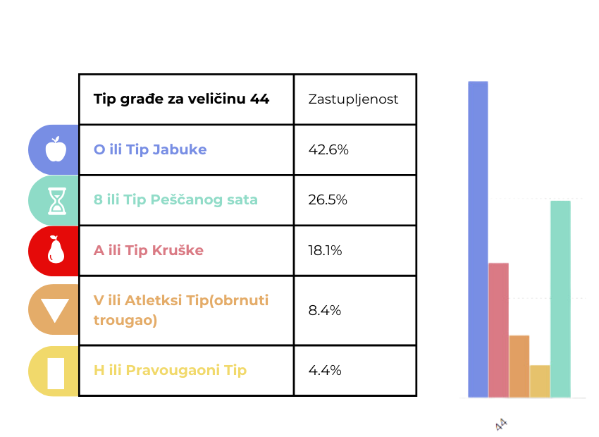 Dodatno, analizira se i raspodela tipova građe prema veličinama odeće, što omogućava bolje razumevanje potreba ženske populacije.